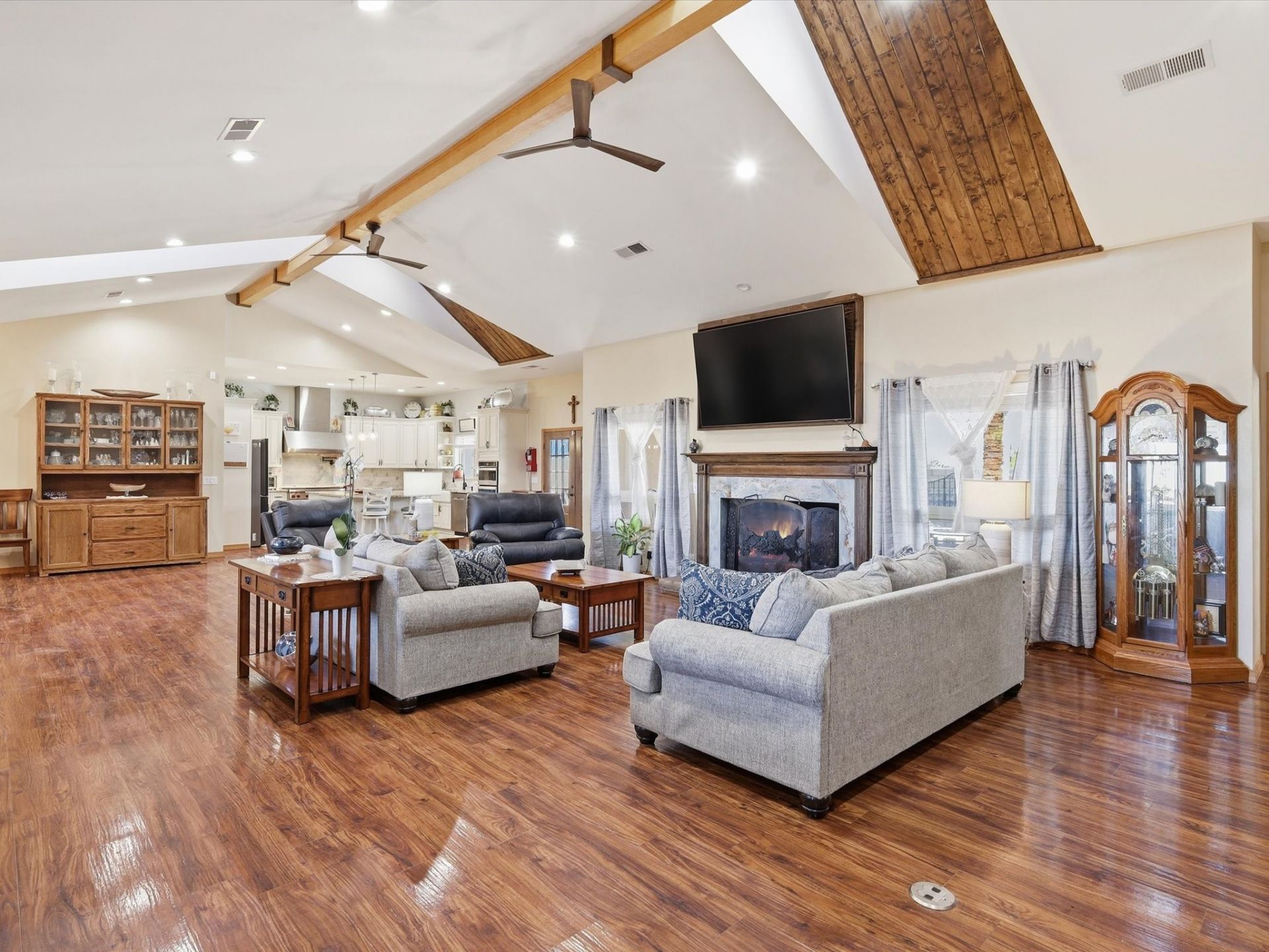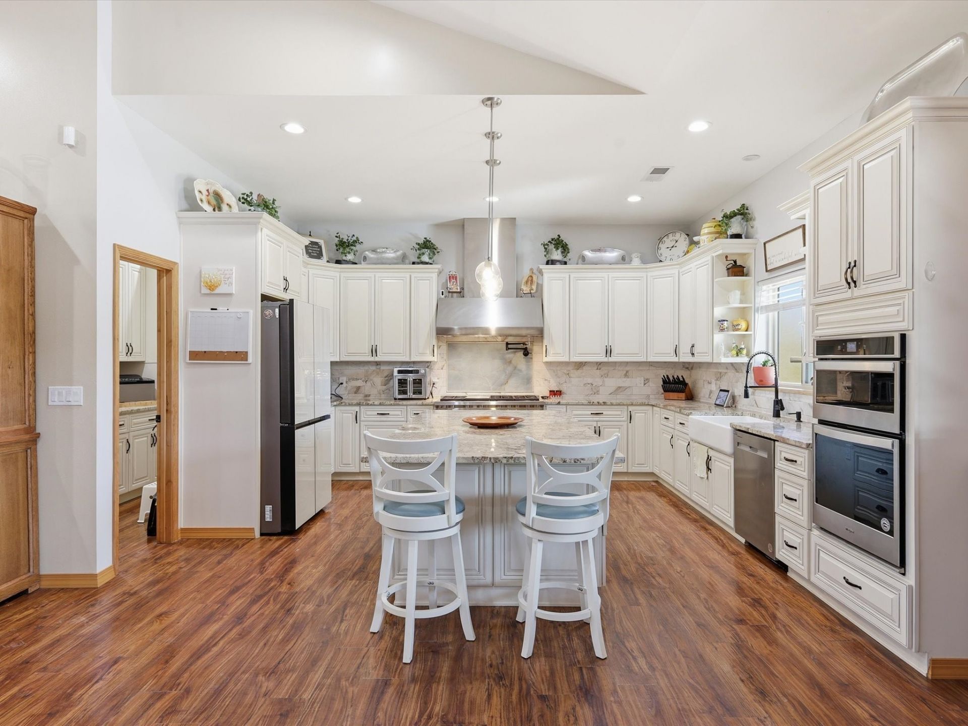 Tucked behind the gates of Valle Serena, with the Sangre de Cristo Mountains as your permanent backdrop, this 2022-built single-level home offers something increasingly rare: true privacy, modern luxury, and a backyard that genuinely delivers on the promise of the Santa Fe lifestyle. Three bedrooms ? two with ensuite baths ? give everyone their own space. Open-concept living centers on soaring ceilings and a wood-burning fireplace that earns its place every cool New Mexico evening. The chef's kitchen is as beautiful as it is functional: premium appliances, custom cabinetry, a commanding island, and a butler's pantry that actually solves the storage problem. Outside, the yard is a destination in itself ? fruit trees, a rose garden, graceful aspens, and a hot tub with mountain views that never get old. Dine on the extended patio as the last light hits the peaks. This is alfresco living at its best. Thoughtful extras round out the picture: pro-panel roof, central refrigerated A/C (plus mini-splits), audio/visual security system, two storage sheds, RV parking with hook-ups, and a 3-car garage with room to work, store, and tinker. Easy access to Hwy 599 for Los Alamos commuters.